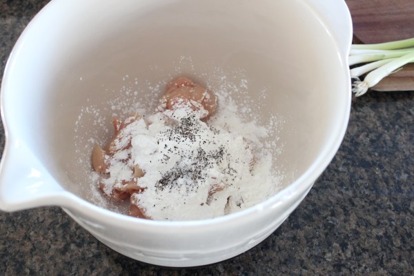 Toss the chicken breasts in the cornstarch, salt, and pepper.