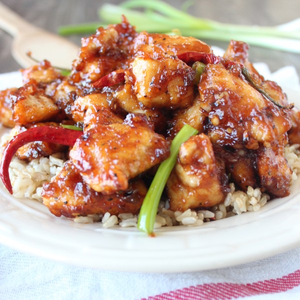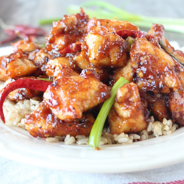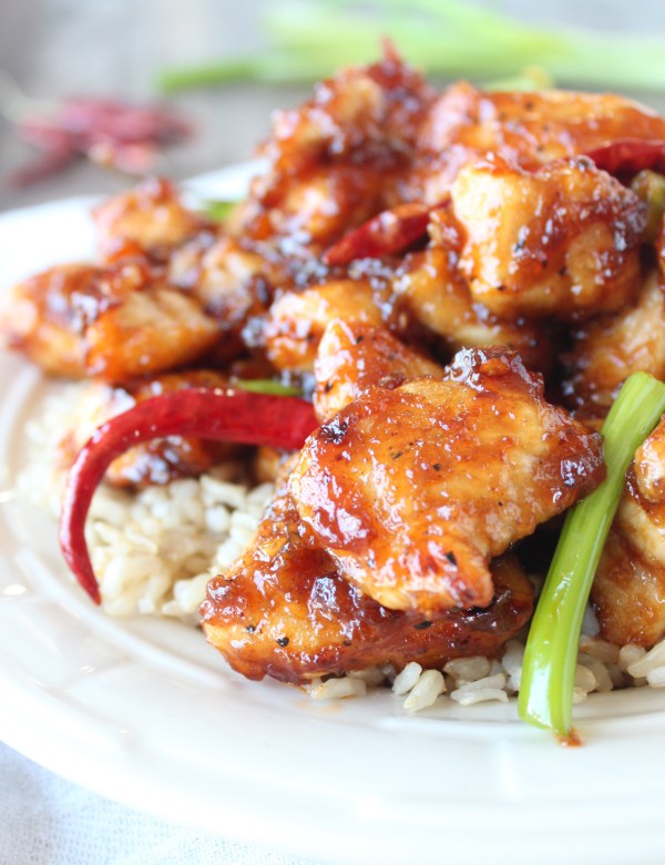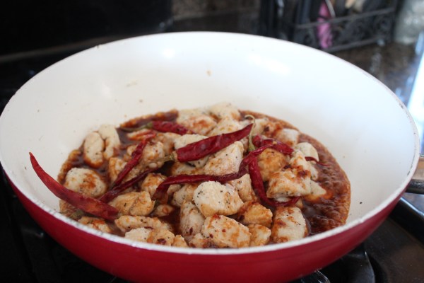 Add the remaining 2 tbsp canola oil to a large skillet over medium-high heat. When the oil is hot, add the chicken and cook for 4-5 minutes. Add the chilies, then pour the sauce over the chicken and cook for 2-3 minutes.